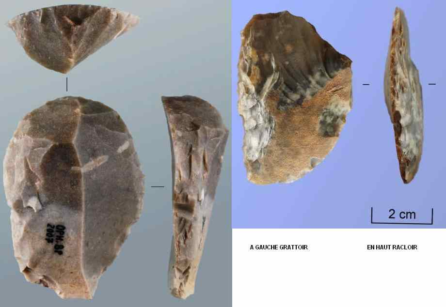 Je vous remercie tous les deux .Enfin je vois d'une façon claire la différence entre un grattoir et un racloir car je pensais grattoir = une lame ou un éclat étroit arrondi à un bout . Racloir = une forme presque droite et plus longue.