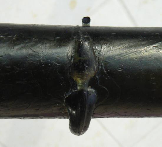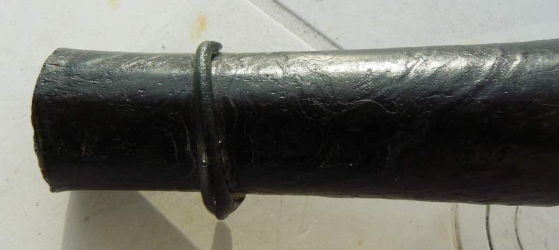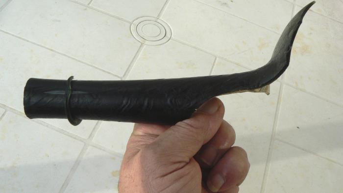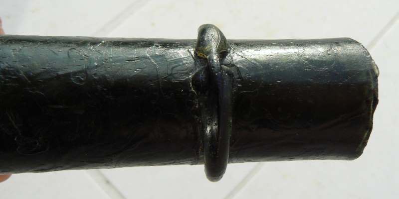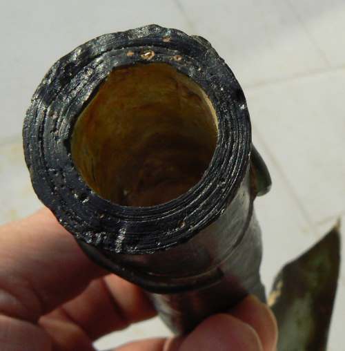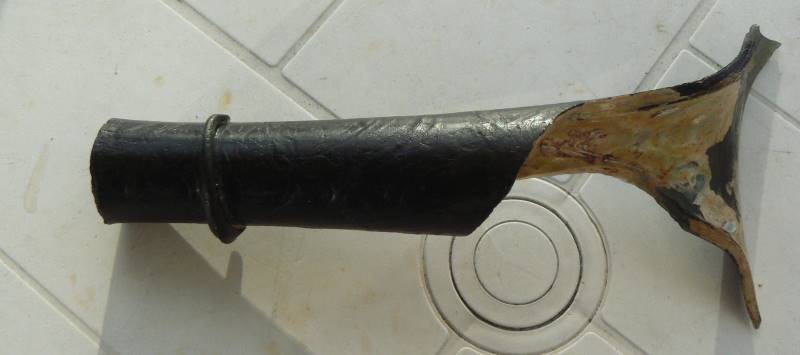 Voici un col de bouteille de 17 cms, je vous laisse imaginer la bouteille, elle devait avoir fière allure. En la nettoyant, l'annelet c'est brisé et j'en ai perdu un bout dans la poubelle, dommage.Il y a peut-être moyen de lui mettre une date ? Merci pour vos avis.