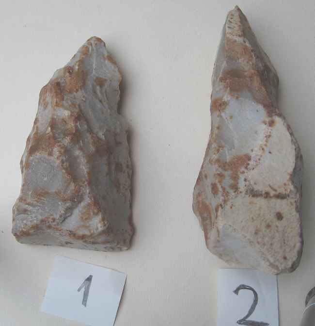 J'ai trouvé ces deux outils qui sont peut étre deux piques montmorencien; ils étaient avec ce que je pensais étre un grattoir .Quand pensez-vous? Dimensions n°1:12cmX6cm, ép.5cm ,n°2:15cmX5cm ép.4cm