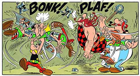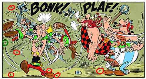 Pour les casques, pas possible de les retrouver, puisque Obélix les ramasse systématiquement pour sa propre collection. Je crois qu'il en a déjà un en main sur cette image.