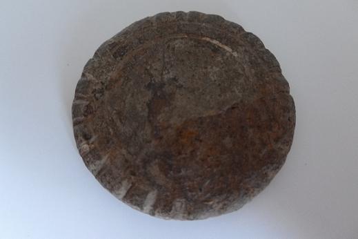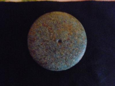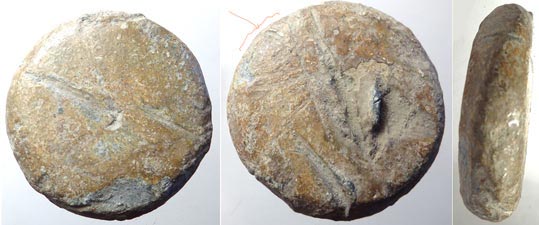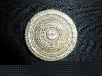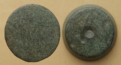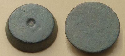 [1856] Légèrement tronconique. Diamètre à la base : 15 mm. Diamètre en surface : 13 mm.