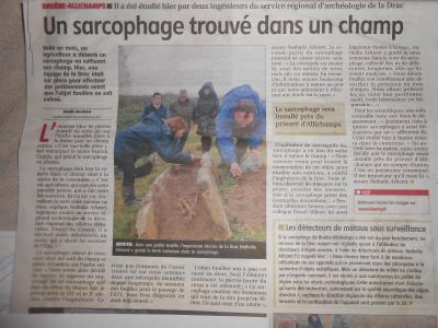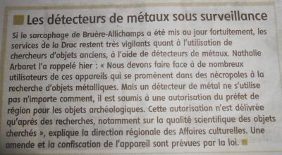 et voila tout commencais bien, la decouverte d un sarcophage dans notre belle region ( le departement du Cher, exactement a Bruere- Allichamps,le centre de la France ) et oui on a cela aussi ,on nous mets un bel article dans notre journal quotidien( la Nouvelle Republique) sur les circonstances de cette mise a jour,et voila pas qu'un petit article nous discredite encore une fois ,au sujet de notre passion,et on disant bien que l'on pille en permanance a chacune de nos sortie.