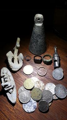 En gros, une bonne dizaine de francs 1960 à 1988, deux jouets en plombs (bateau et ancre), 3 bagues fantaisie, une alliance en or (2.52g), un trés gros plomb de péche pour filet, un sifflet (certainement pour les anciennes maisons de douanier que l'on trouvent encore sur la cote nord) et à mon sens le plus interressant (car mon 1er non savonette) un Napoléon III en argent (BB : Strasbourg) de 1866 1Fr (2h00 dans le jus de citron et nettoyage à la gomme blanche).