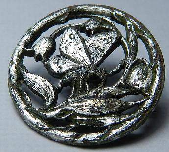 bouton ajouré, avec un papillon qui butine 3 fleurs, en métal argenté,