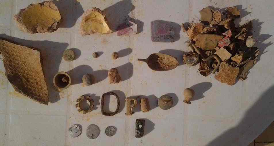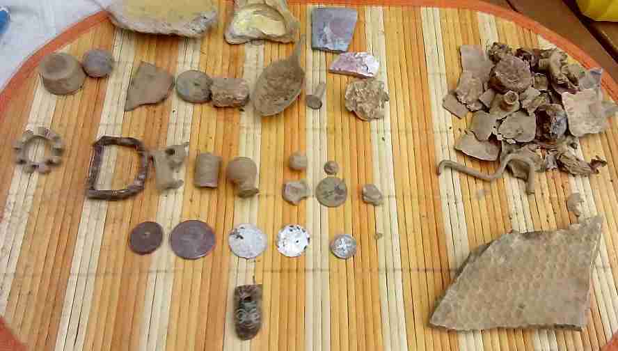 au niveau des pièces on a un louis XIV deux denier quelque chose (trop lisse) une médaille en allu et ensuite des balles de mousquets, des bout de poterie, etc... etc...
