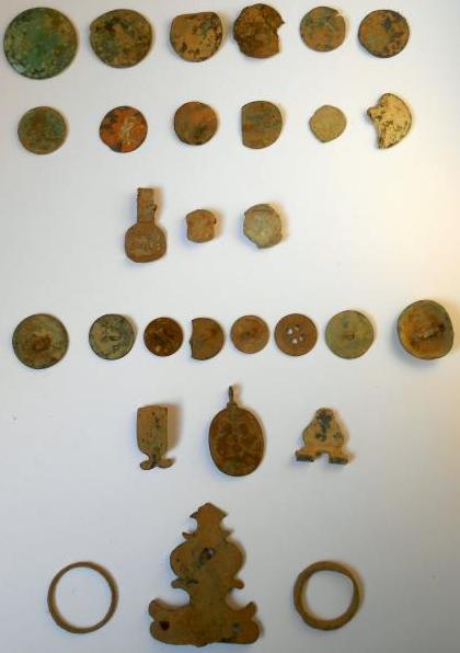 Trois plombs de scellées, dont un bien lisible déjà , huit boutons bien fatigués, un objet inconnu, une jolie médaille en bronze à bélière d'époque 17ième siècle avec de beaux reliefs, un morceau de chape de boucle, une grosse applique, de coffret je pense. Et les incontournables anneaux en bronze.