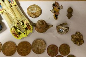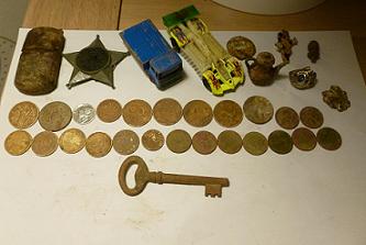 [1853] a tous, sortie de 3h00, pièces américaines, française, + deux autres étrangères , une bague, 2 bijoux fantaisie , une petite théière,1 camion, une voiture,1 briquet , une étoile de shérif, pour le partage bonne soirée a tous.