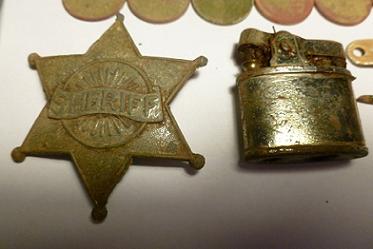[1853] , a tous sortie du jour, toujours les mêmes monnaies, un briquet, un insigne militaire,une étoile de shérif, pour les 20 centimes de francs, une vingtaine dans le même trou, le reste des américaines, et une plaque pour chien, pour le partage bonne soirée a tous.