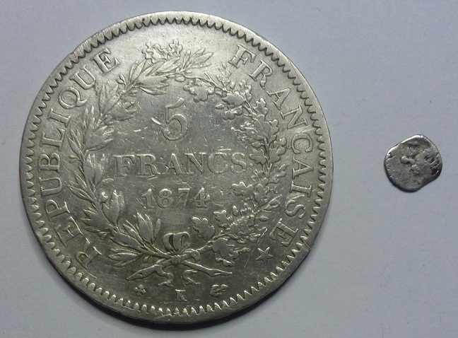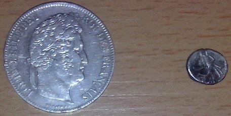 Une 5 francs Louis Philippe 1er, un gros pavé de 37 mm et à côté un quinaire des allobroges à l’hippocampe d'à peine 13 mm environ