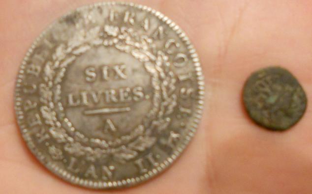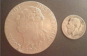 Sympa ce sujet, voici les miennes : un écu de 6 livres Louis XVI de 38 mm et une 50 centimes Léopold II roi des belges de 18 mm.