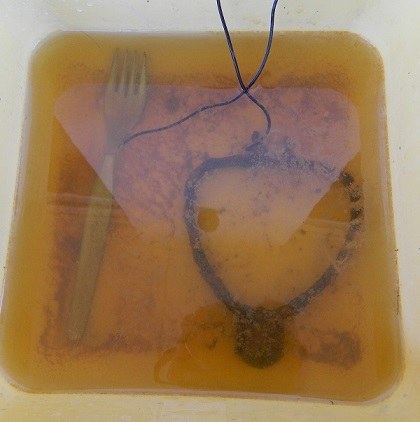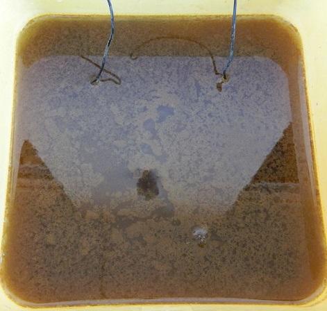 [19] Sortie du bain electrolytique pour l'etrier. J'ai chauffé le tout au four, puis passage à la dremel ainsi qu'a la paille de fer. Le tout est prêt à etre plongé dans une solution de paraloïd ou palaroid...Je ne sais plus.