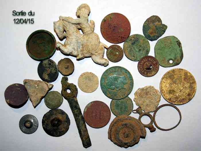 7 monnaies, des boutons ont un plat numéroté que je n'avais pas encore (le N° 65), une clef de montre, ... , et un indien !