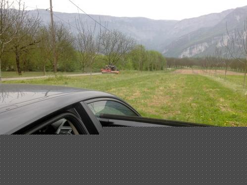 Et situation cocasse, le proprio des parcelles de noyers m'a demandé de me garer au milieu d'un de ses champs car il était entrain de tondre son domaine et devait finir les bords de route (voir photo ci-dessous )