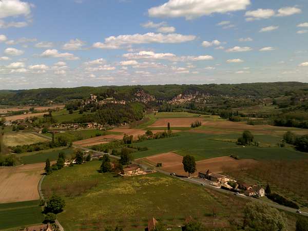 vue sur la vallée de la Dordogne avec en fond au bord de la falaise le village de la Roque Gageac