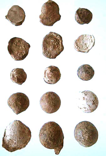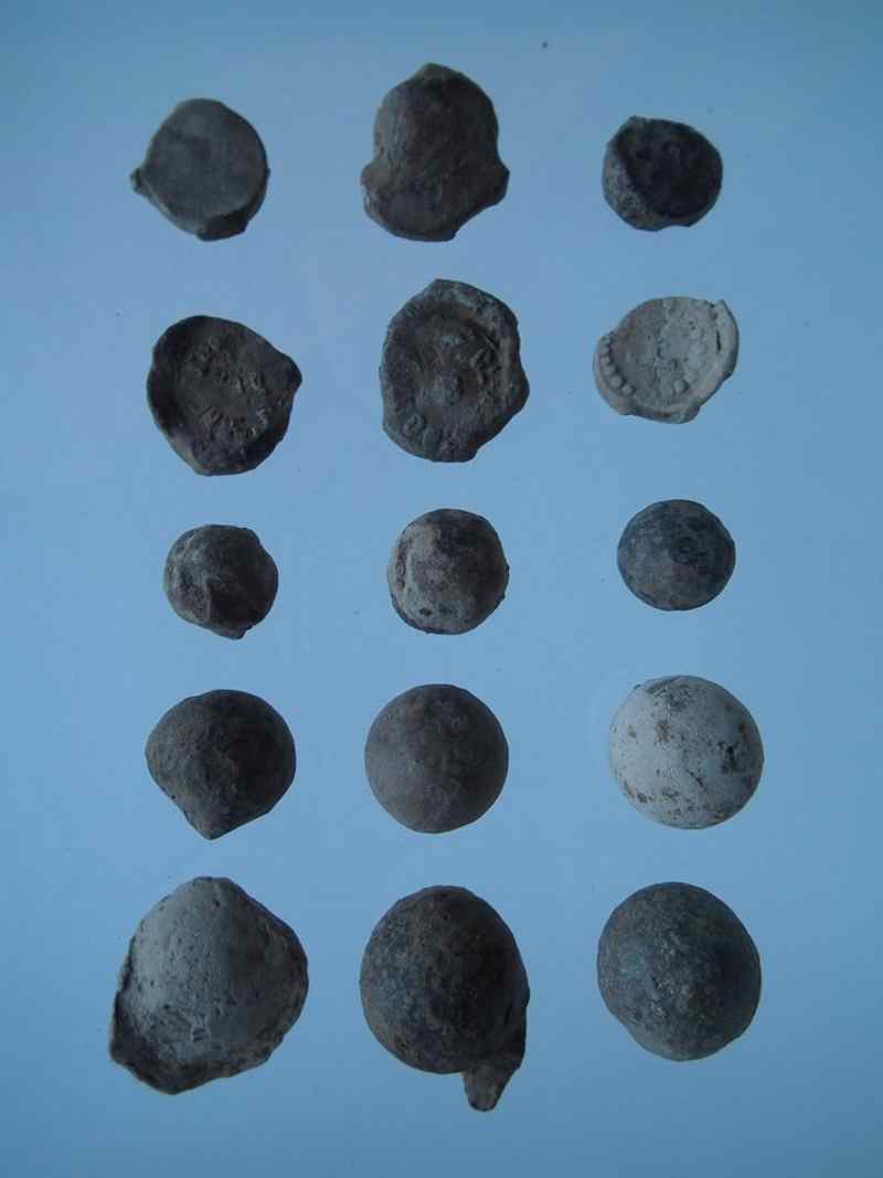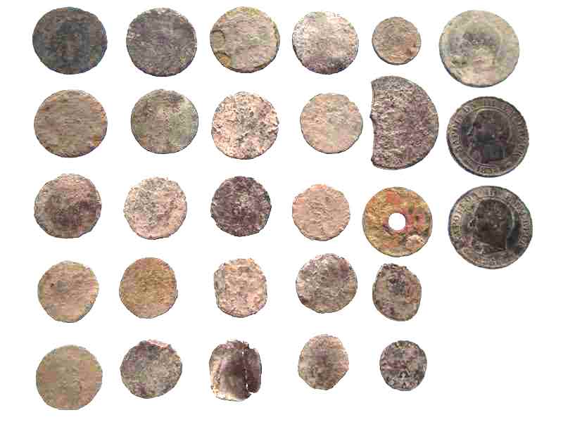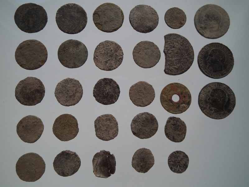 Bidouille,si tu recomptes en RO c'est 28 monnaies,la seule que je pense que tu as identifiée,et je t'en remercie ça doit être celle de droite en bas(Gaston d'Orléans denier tournois,cuivre 1650/1651)