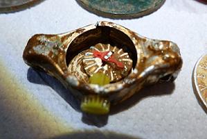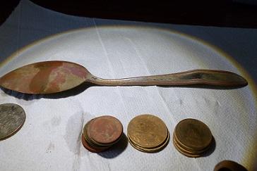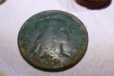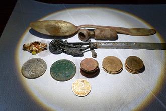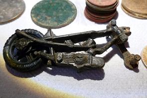 [1853] , a tous, rien d' extraordinaire, le reste d' une moto, une montre d' enfant,une cuillère, monnaies française, américaine,italienne, une monnaie de Singapour, et une barre, je pense que c' est du plomb, pour le partage, bonne soirée a tous.