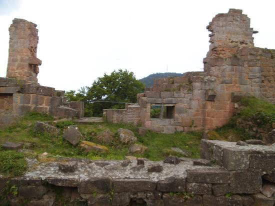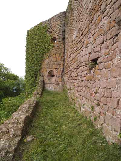 [1854] A quelques mètres en contrebas du château, se dresse un 'mur païen' traditionnellement comparé à celui du Mont Ste Odile (à une 20aine de km de celui-ci). les panneaux le donnent comme datant du VIeme siècle avt JC (âge du fer). Comme pour le mur païen du Ste Odile, les blocs cyclopéens étaient solidarisés entre eux par des tenons en bois, dits 'en queue d'aronde'. Mais la forme des blocs n'a rien à voir avec ceux du Ste Odile ! La datation est elle aussi incertaine. Au pied de ce mur, un trésor de monnaies romaines aurait été mis au jour dans les années 30. L'endroit a depuis été largement fouillé par les archéologues.