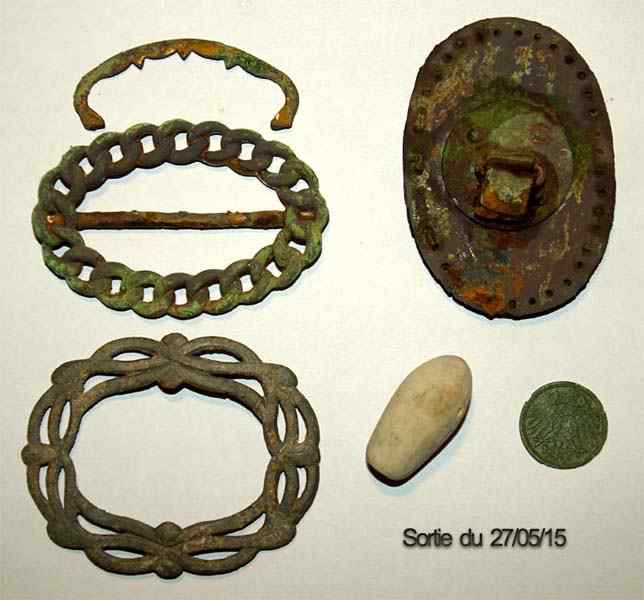 Deux boucles 18ème je pense (de chapeau ?), 1 Pf 1892 A, un objet mystère formé de deux plaques avec du cuir entre (quelques lettres apparaissent derrière l'attache : 'KEIT ..... LY', et un suppo en plomb ! +;o)+ sans compter les nombreux bouts d'alus et de plomb !