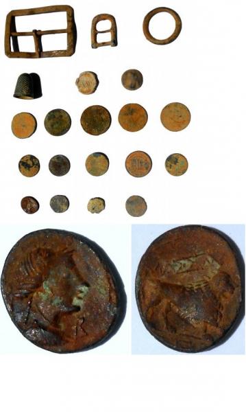 Concernant les monnaies, qui sont à nettoyer bien sur, celle située en bas à gauche sur la photo me parait intéressante à identifier et j'aurai besoin de vos avis et connaissances.