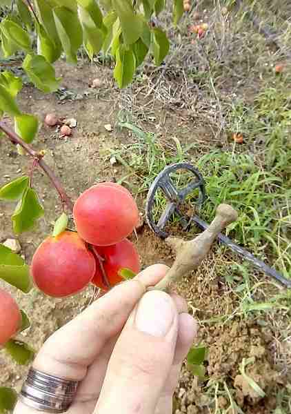 Il n'y a que de la ferraille dans les abricotiers. Tu prends des vitamines en même temps que tu détectes