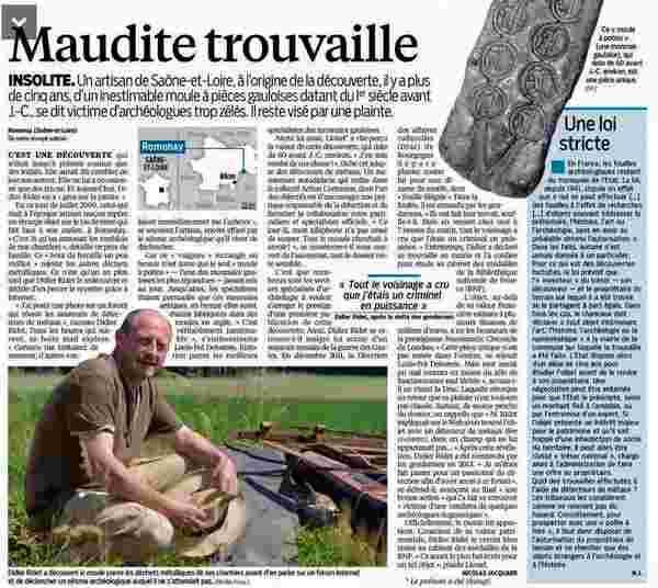 La réforme du Code du patrimoine prévue l'an prochain pourrait remettre en cause le loisir des 10 000 utilisateurs de détecteurs de métaux. Le Conseil national de la recherche archéologique est opposée à la pratique de la détection qu'elle assimile au pillage. Son idée: faire de la France entière un site archéologique pour interdire l'usage des détecteurs de métaux.....
