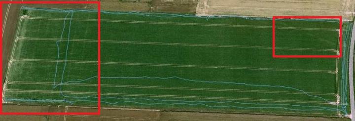 Par contre la trace en haut à droite doit en être une car on la voit apparaître de l'autre coté de la route à droite et elle s'efface dans les champs pour réapparaitre un peu plus loin à gauche. Encore du blé dans le champs d'à coté et je ne sais pas si c'est le même propriétaire, j'ai pas pu trop discuter avec lui, il était dans son tracteur et en plein boulot. Je lui ai juste demandé son nom au cas et d'où il venait.