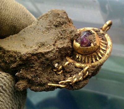 Il y a 3 ans ils ont découvert ce magnifique bijou de chapeau daté vers 1460, époque de la guerre civile en Angleterre appelée ' La Guerre des Roses '. Il est en or 22 carats avec améthyste.
