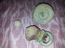 Apparemment ce serait une balle de mousquet, peut etre une poignée de meuble et une clef romaine (?)