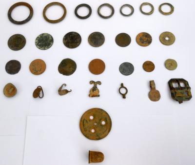 Les inévitables anneaux en bronze, des monnaies variées pas toutes identifiables, je verrai après nettoyage, deux boutons dont un composé comme un bouton de cape ou de blouse, une jolie boucle, une clé de montre, un plomb de scellée, ma première agrafe à double crochets avec motifs que je vais mettre à identifier, pour être sur de mon idée, coté ID, pas de chance elle est tordue hélas. Un dé à coudre, et, enfin, cet objet circulaire, percé de quatre trous, dont je ne vois pas bien la fonction, mais qui m'a procuré une belle émotion car j'ai tout d'abord cru à une très grosse monnaie avant de faire un pré nettoyage sur le lieu même.