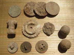 De gauche à droite et de haut en bas : un Double-Tournois sous Louis XIII, une p'tite boursée englobant 2 monnaies de 1F des années 40 avec un bon de commerce de 1f, un buste en plomb ou étain (?), une capsule ou autre avec la lettre C, une attache de bijoux (?), 2 boutons type Vendéen, et un bouton normal, ainsi que 2 balles de mousquet !
