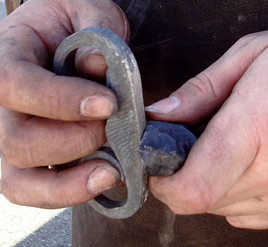 Cet aprem, dans une petite fête dans un village voisin, j'ai eu la chance de retrouver un de mes ancien élève que j'ai eu il y a environ 25 ans, en fait c'est lui qui m'a reconnu... Forgeron, c'est pas son boulot mais sa passion et avec un professionnel , il fait des démonstrastions de forgeage lors de fêtes traditionnelles où les vieux métiers sont à l'honneur...L'objet qu'il a confectionné ci-dessous est dans son répertoire puisqu'il est aussi passionné des outils et armes médiévales...