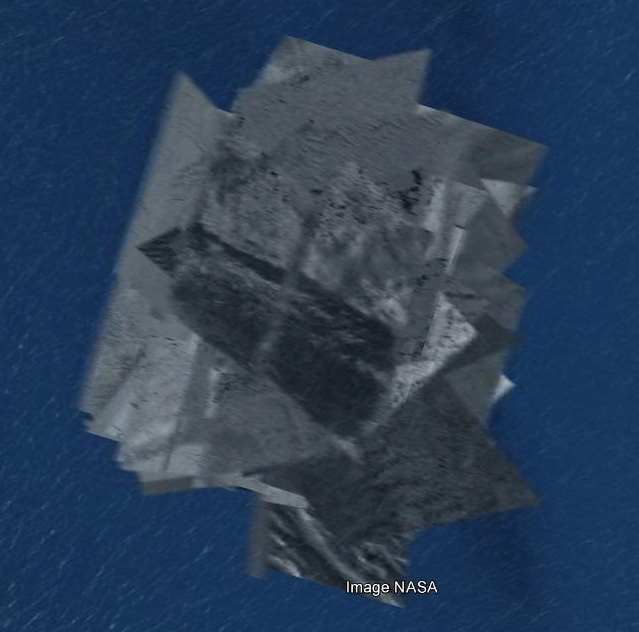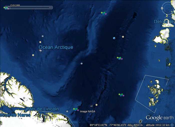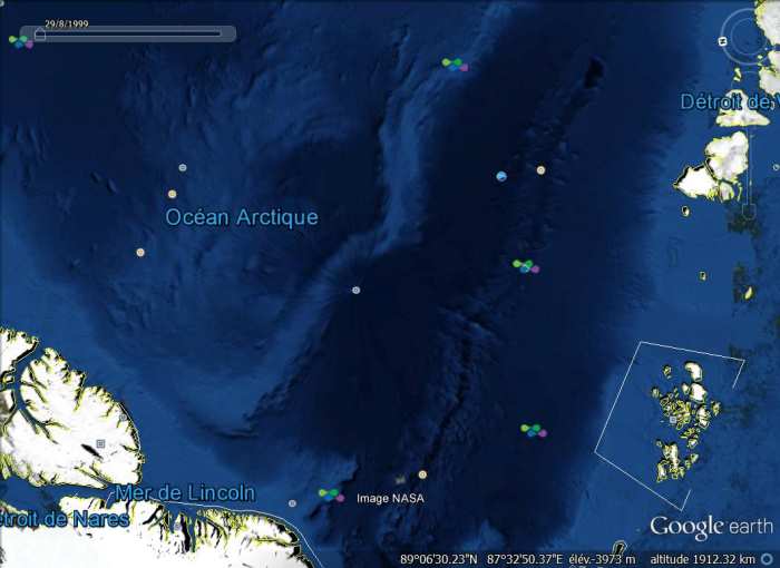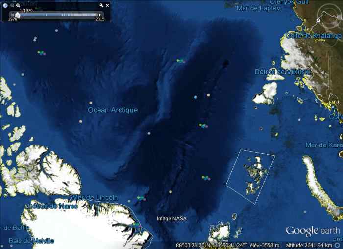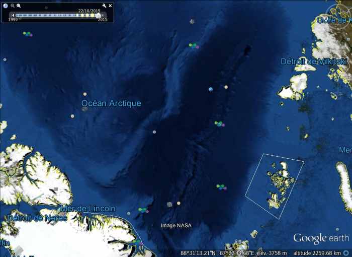 Le pole nord est pas mal irisé aussi. La photo de 1970 montre un fond marin avec les points ronds qui indiquent des lieux. Celle de 29 8 1999 montre l'apparition d'un petit rectangle en bas entre le point blanc et 'image NASA', celle du 15 9 1999 montre l'apparition d'un 2em rectangle en dessous du O de 'Ocean arctique et celle du 6 2001 l'apparition d'un 3em rectangle en haut à droite au-dessus de la grappe de couleur. Pareil que l'ile du détroit de Bering, c'est un empilement de carte ou autre en vrac.Quel explication en donner ?