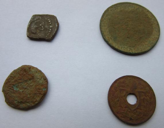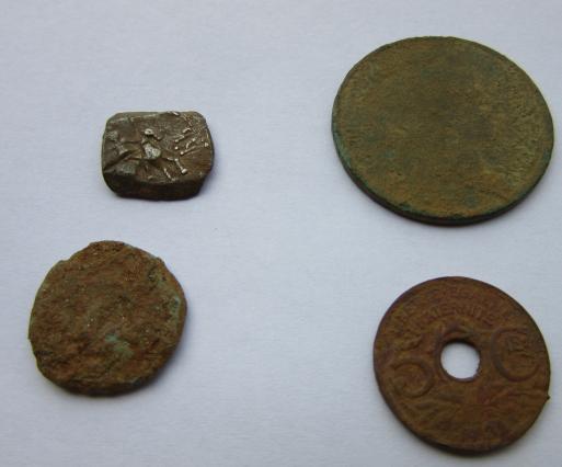 Enfin une bonne sortie avec 4 monnaies : une gauloise (en argent ? (ma première ), un 5 centime Lindauer de 1932, une 5 centimes Dupuis de 1917 (nettoyage en cours) et ce qui me semble être une monnaie romaine ( ) en bronze très très bouffée . Pour cette dernière j'ai à peine tenté de la gratter sans forcer avec un cure dent mais la patine est très fragile et s'en va très vite... et en plus je ne pense pas pouvoir faire ressortir un quelconque motif vu l'état dans lequel elle est . Pensez-vous que je puisse faire quelque chose pour la sauver ?