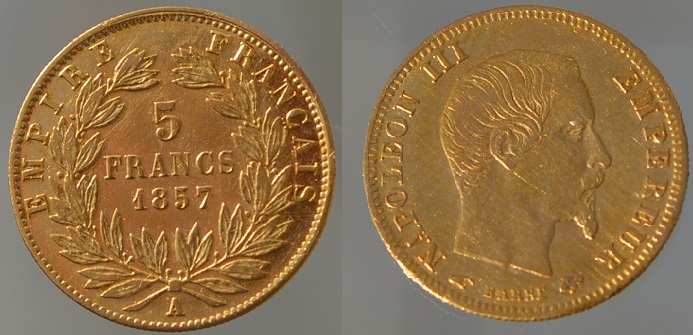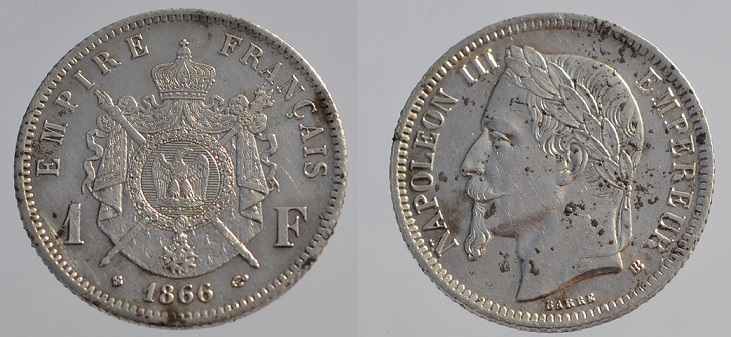 La voici, c'est une 5 francs Napoléon III 1857 atelier A en superbe état. Avant de la trouvée j'ai d'abord sorti une 1 franc Argent Napoléon III de 1866 atelier BB ( ma deuxième de ce type trouvée en détection l'autre est de 1869). Donc une mini boursée.