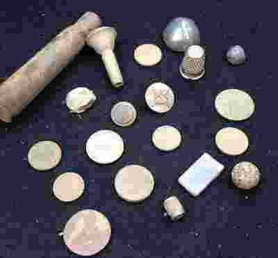petit résumé : 1 liard de france , 1 franc morlon , 2 savo , 1 demi grelot , 1 cartouche de 12.7 , un bouton napoléon , 1 bouton inconnue , 1 dé a coudre en argent , et quelques monnaies de francs .