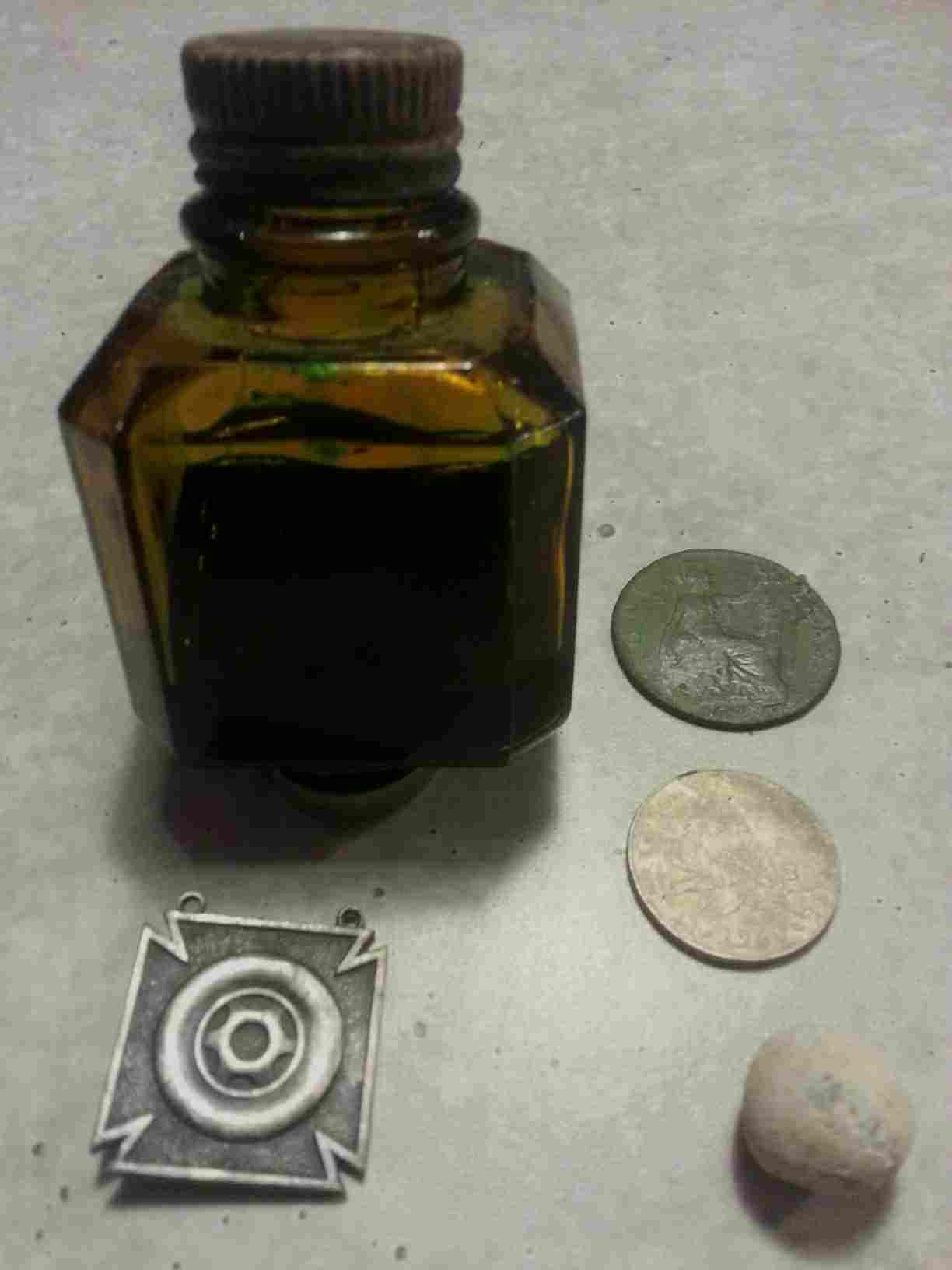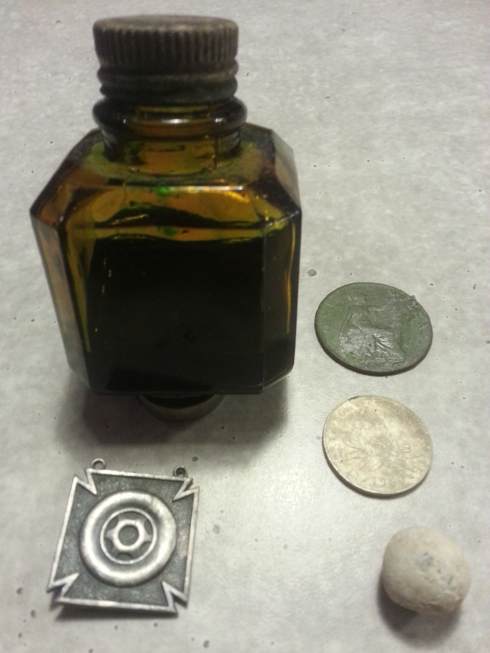 Bonsoir tout le monde, sortie sous la pluie et dans un vent a décorner les bœufs, j'ai pris l'air c'est ça qui est bien...ça change les idées.... Donc voila, un flacon d'encre verte a demi pleine, 1 semeuse de 1960, 1 penny avec une date illisible, et whaou une balle de mousquet, c'est peut être un détail pour vous mais pour moi ça veut dire beaucoup...ça me fait voyager dans le temps!!!