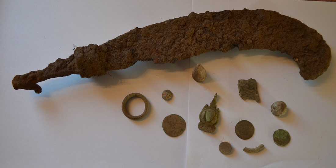 Une capsula, un anneau ou bague, une pointe en plomb, un outil pour ébrancher, 3 savos et tout petit bouton en tombac.