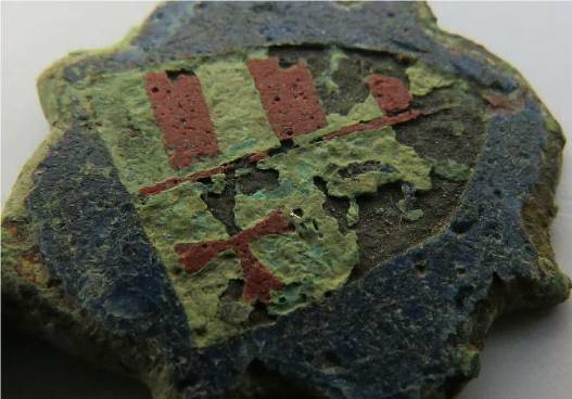 « Comme indiquées ces armes sont celles de l’archevêque de Narbonne Bernard de Farges (ou Fargues) ou quelqu’un de sa famille. Ces armes figurent notamment sur deux châteaux des archevêques de Narbonne : Capestang et Villerouge-Termenès (En langage héraldique ces armes se décrivent ainsi : parti : en 1, coupé de croix pattée de sable sur fond argent et pot de sable sur fond or ; en 2, trois fasces de gueules sur fond or. »