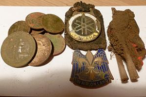 [1853] ,a tous, sortie de l' après midi, quelques monnaies, le reste d' un porte clé, le reste d' une moto, et un insigne, pour l' insigne nettoyage et photo pour identification, bonne soirée a tous.