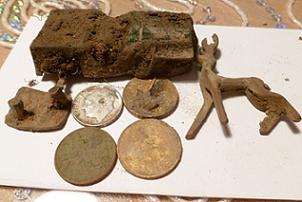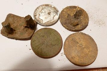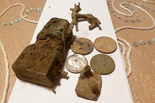 [1853] , a tous, petite sortie sous la pluie dans mon bac a sable,toutes les trouvailles sont dans leurs jus, une monnaie en argent, une monnaie en cuivre américaine, 10 centimes de francs, 10 centimes d' euros, une jeep, et une biche, pour le partage bonne soirée a tous.
