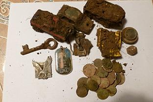 [1853] , a tous, je viens juste de rentrer de ma sortie dans mon grand bac a sable, résultat, un bel insigne militaire,un porte clé, trois voitures, une clé, et des monnaies, tout les objets sont dans leurs jus, pour le partage, bonne soirée a tous.