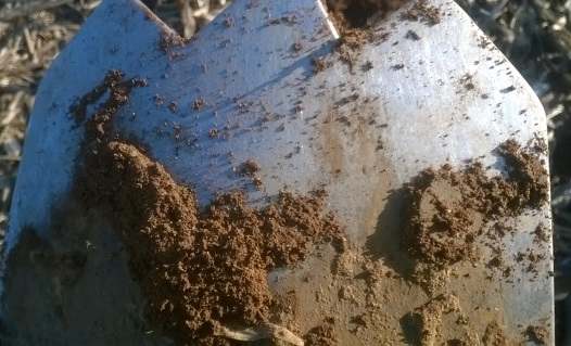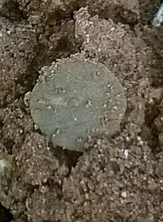 Trouvaille 1 : A peine débuté le labour qu'un premier bon son se fait entendre, je creuse une dizaine de centimètres, repasse le disque au dessus du trou, plus rien, parfait la cible est déjà sortie, je passe au dessus du petit tas de terre ........ rien non plus .... ... elle m'a quand même pas fait le coup de rester coller a la pelle ....
