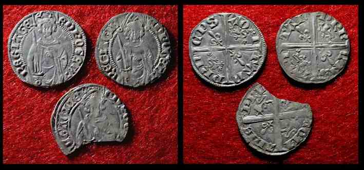 Sol époque Charles III en billon : A/(croix de Lorraine) CARO. D. G. LOTAR. B. DVX. (Charles, par la grâce de Dieu, duc de Lorraine et de Bar). Écu couronné mi-parti de Lorraine et de Bar.