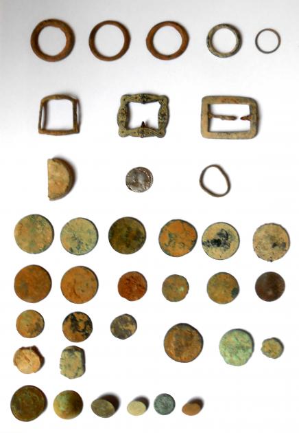 Les inévitables anneaux de bronze qui parsèment les vignes et les champs par chez moi, trois boucles dont une, ajourée, assez jolie, un gros module de plomb coupé en deux, une jolie monnaie d'argent (1/10 écu Louis XV je crois) que je posterai côté ID, avec la boucle, pour confirmation, une bague ornée de stries mais malmenée, des Napoléons, des Liards, des pièces inidentifiables en l'état à nettoyer au cas où, trois bronzes dont un Romain, à nettoyer pour ID, huit boutons dont un décoré et marqué 'République Française'. Un plomb de sac et un module de forme trapézoïdale avec inscriptions que j'espère pouvoir déchiffrer.