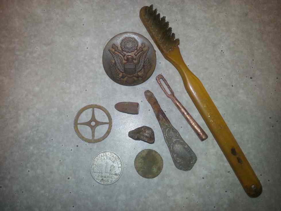 Donc une brosse a dent us, une queue de cuillère, une balle, un engrenage, une savonnette, un franc 1943, et une insigne us de sergent a priori, pas de quoi fouetter un chat...