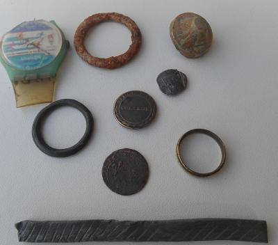 Jolies trouvailles, monnaies, bouton, anneaux, et en haut à droite de quoi s'agit-il ?
