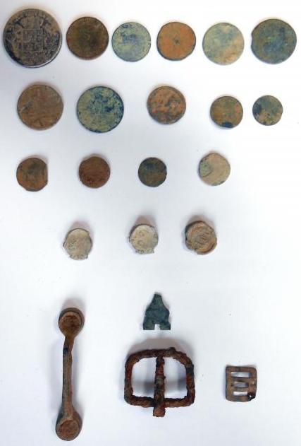 Je ne regrette pas ce changement de destination : 15 monnaies, 3 plombs, une boucle en fer, une chape de boucle, une boucle de corset, une anse de marmite ou de couvercle.