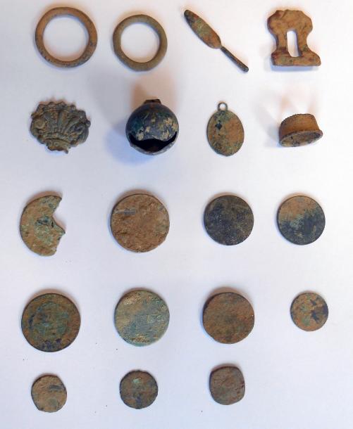Donc, les anneaux, incontournables dans les vignes et les labours d'ici, un drôle d'objet que je vais mettre en identification, un tour de serrure de coffret, une décoration en bronze, un grelot sympa et entier avec son battant encore à l’intérieur, une médaille en bronze, une bague à coudre, 11 monnaies à faire parler au nettoyage, dont une de forme bizarre en bas à droite.
