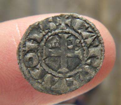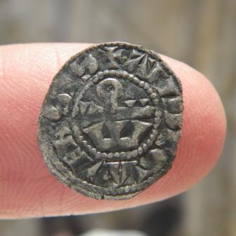Quoique puisse laisser suggérer l'agrandissement, cette petite monnaie est très belle. Trouvaille Ouest Touraine. 14mm, 0.33g (pour 0.5 attendu. Cela correspondrait plus à un poids de tiers de denier Angevin qu'à sa moitié)
