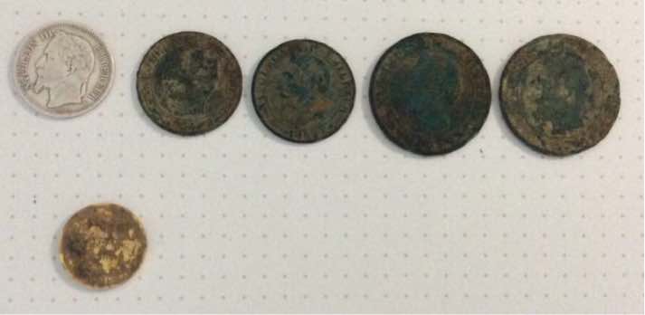 Ma première pièce était en fait deux pièces (celle si est la dernière trouve) deux cinq centimes napoléons3 en parfait état, trouvées dans mon jardin à l'essayage de l'appareil 😀. J'habite dans une très vieille maison qui était encore une ferme il y a pas si longtemps et pas loin d'un château depuis j'ai retourné un peut le jardin et j'ai fait deux autres Napoléon a 2M des premières, 1 franc alu, 2 sol Louis 16 1 pièce belge 1936, boucles etc...